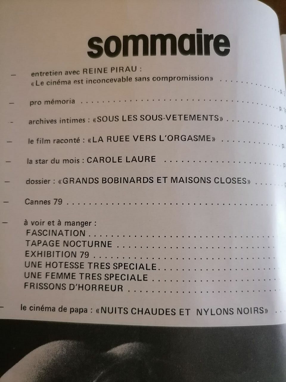 Premier numéro de cette revue consacrée à l’érotisme au cinéma avec un entretien avec Reine Pirau, Carole Laure en star du mois et dossier « Grands bobinards et aux maisons closes ». Intérieur couleur et noir et blanc, nombreuses photos. Marques d’usage mais bon état général. 20 €