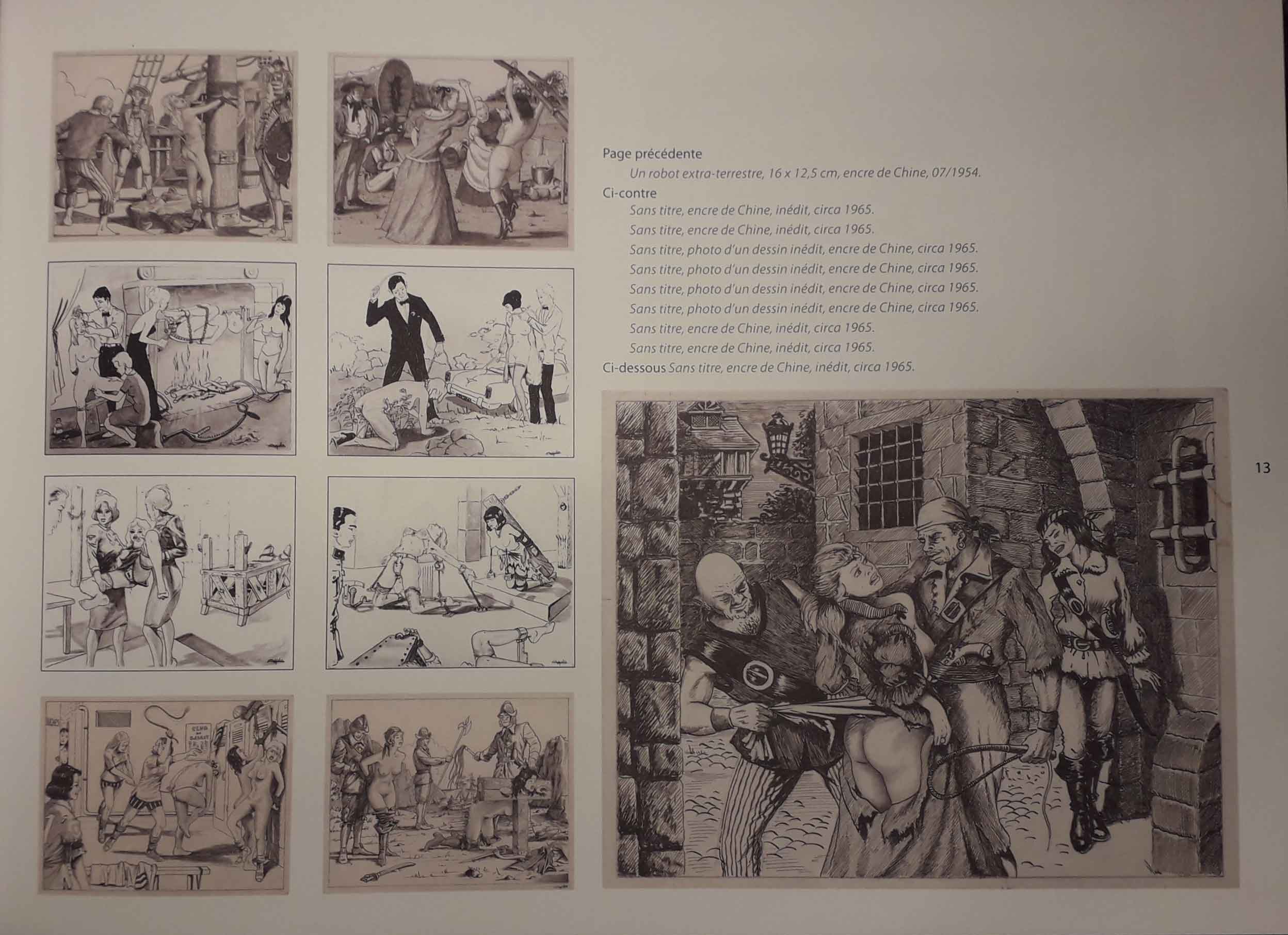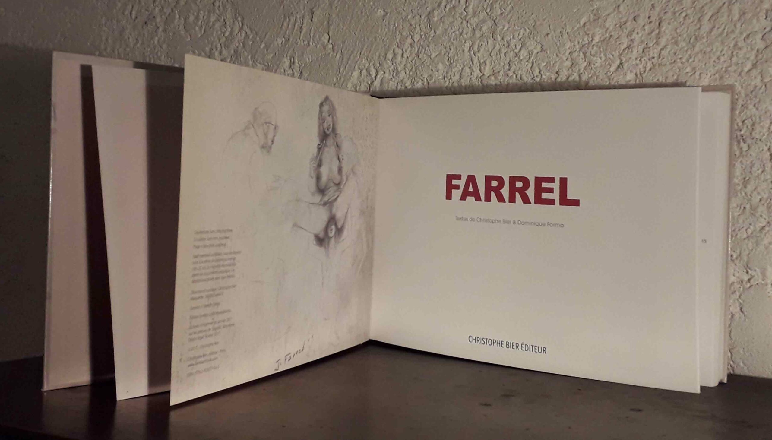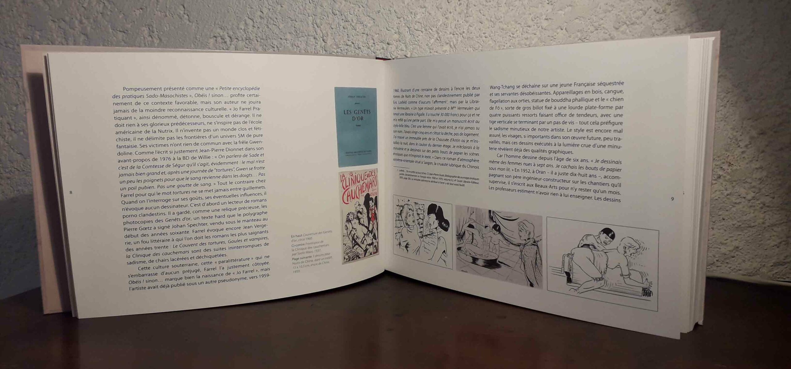 Peu nombreux, les textes sont très bien renseignés et ont l’élégance de la concision. Le livre commence par une présentation par Christophe Bier de Joseph Farrel et de son œuvre. On y rencontre ainsi l’homme et l’histoire de ses ouvrages. Puis de courts textes ouvrent chaque chapitre, organisés autour des thèmes récurrents des dessins de Farrel (plein air, la mariée, voyeurisme, torture des seins, etc.). Heureusement, aucune tentative d’explication (sociale, psychanalytique, que sais-je encore ?) de l’univers de Farrel, seulement des observations. Parfois, c’est simplement Farrel qui commente l’un de ses dessins, narre le récit de ce qu’il s’y passe. A la fin, l’éditeur a eu soin d’ajouter une bibliographie précise et exhaustive des œuvres du dessinateur, mentionnant leurs éditions originales mais aussi leurs éventuelles rééditions. Les couvertures des ouvrages sont même reproduites en couleur.