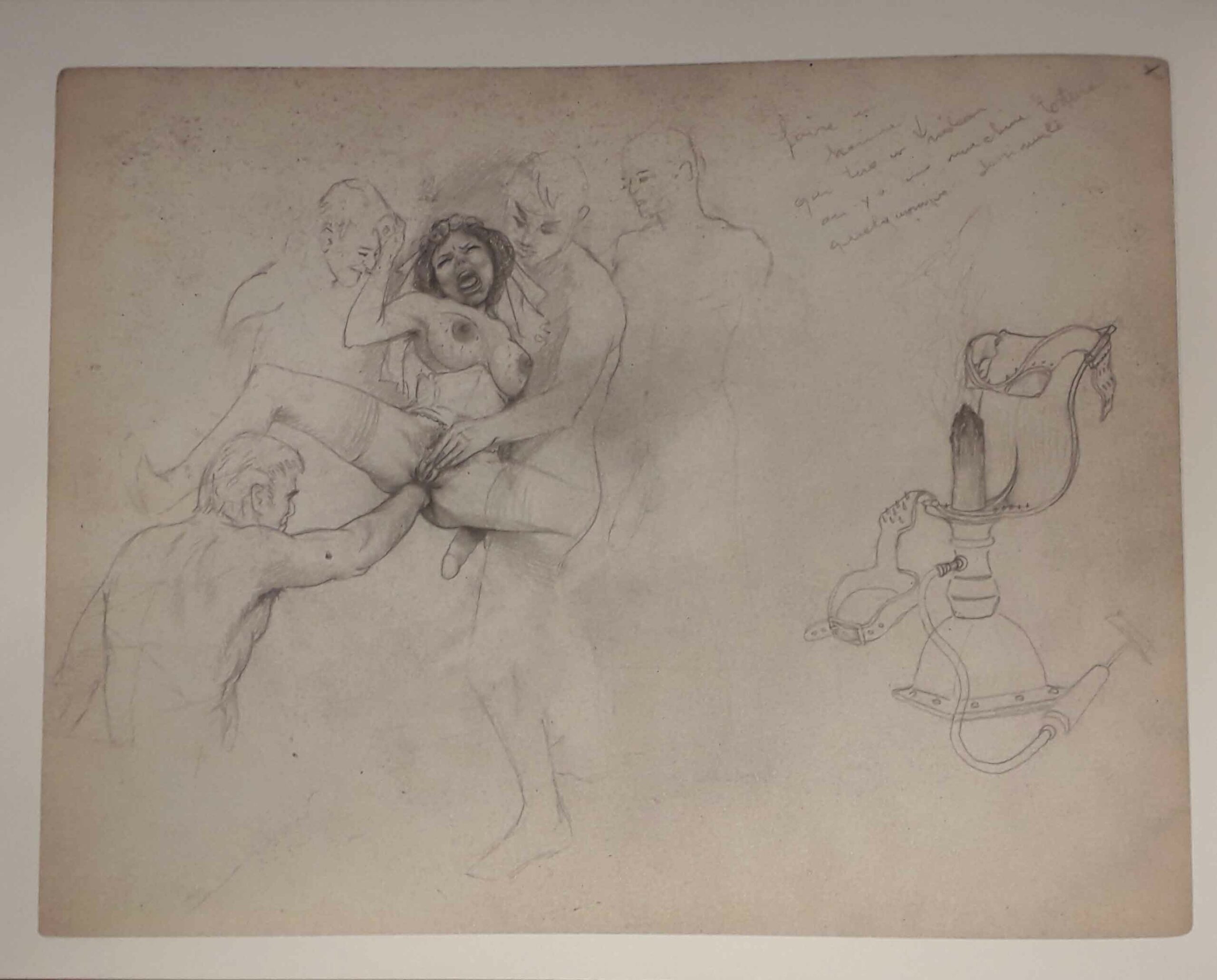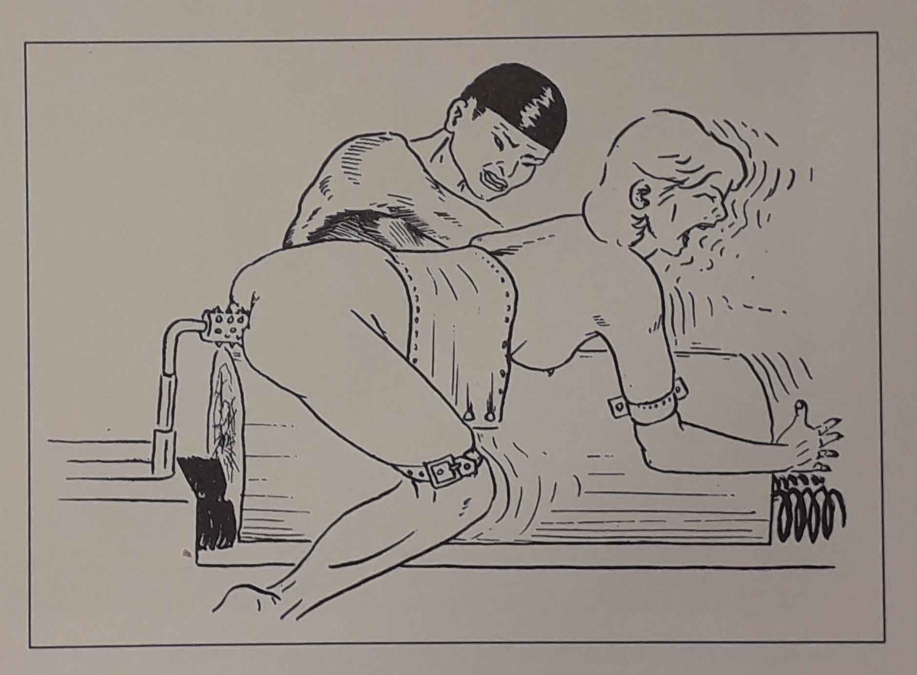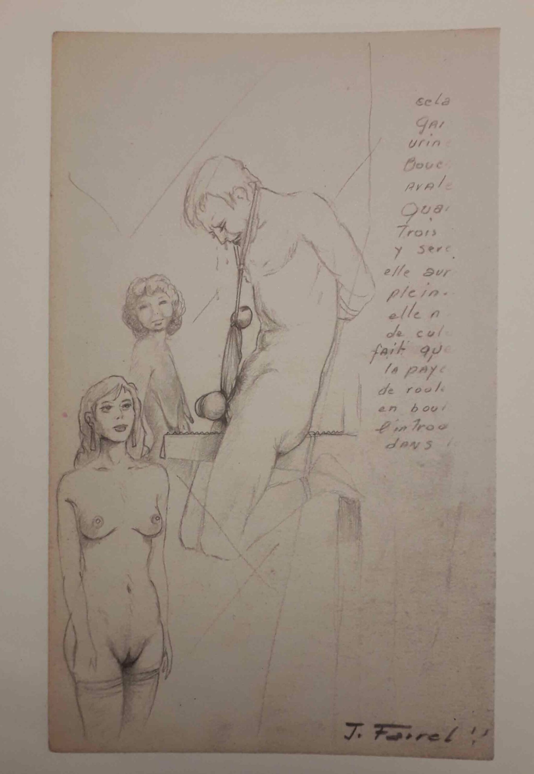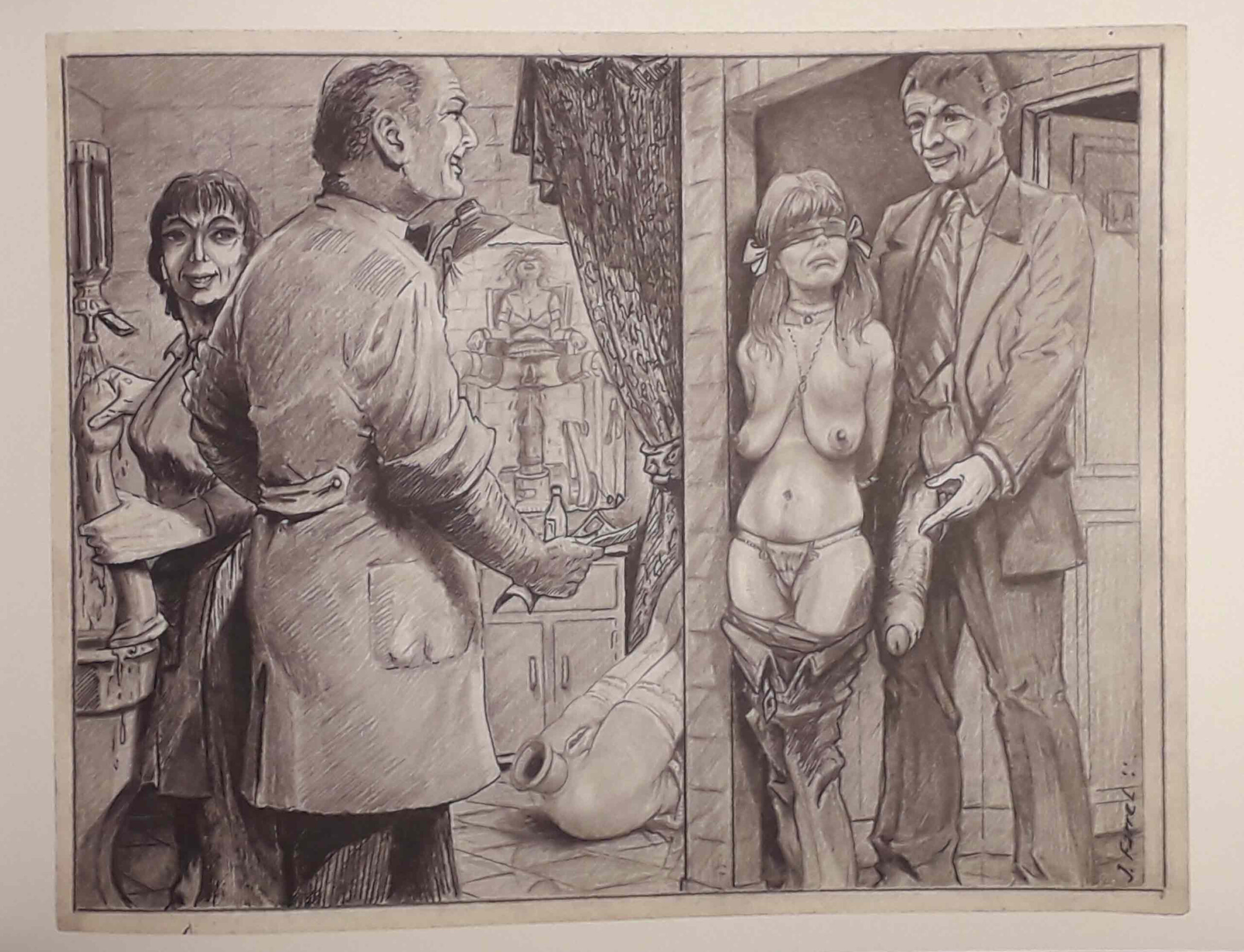 Je ne veux pas revenir ici sur les œuvres de Joseph Farrel, puisque j’en ai parlé ailleurs. Mais j’ai trouvé dans ce livre de surprenants dessins de jeunesse (du moins antérieurs à ceux que je connaissais), pas nécessairement érotiques, où l’on retrouve bien le trait de l’artiste. Son style n’y est pas encore abouti, affirmé, mais sa patte y est déjà reconnaissable. J’y ai aussi croisé quelques curieux monstres et, bien sûr, des sévices à n’en plus finir, parfois plus sadiques encore que ceux que je connaissais déjà chez le dessinateur. Et, pince sur le téton, j’y ai même découvert un dessin où, pour une fois, c’est l’homme qui est la victime de ces dames : improbable chez Farrel !