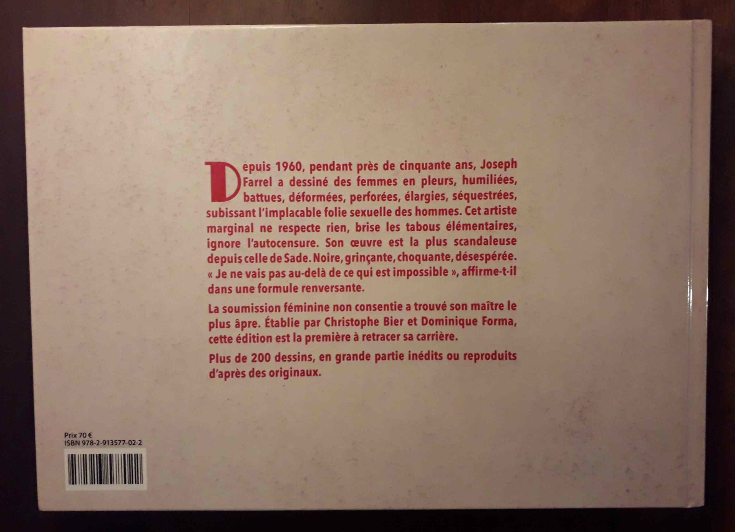 Le livre que je vais vous présenter ici n’est pas un livre ancien. Au contraire, c’est même une nouveauté puisqu’il est sorti il y a une année à peine, en février 2017. Il s’agit d’un beau et généreux volume consacré à Joseph Farrel, dessinateur SM à l’œuvre aussi dérangeante que méconnue dont j’ai déjà eu l’occasion de parler. Il a été publié par Christophe Bier, qui en a également rédigé les textes avec Dominique Forma, et s’intitule simplement : Farrel.