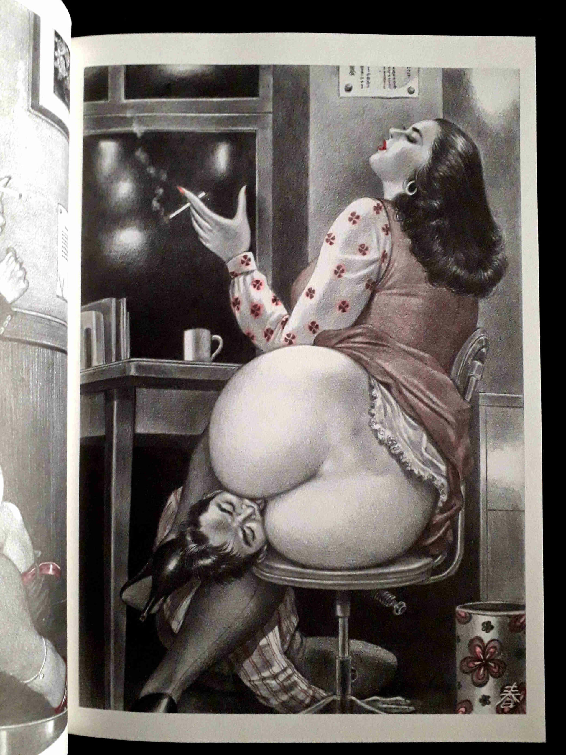 Sur l’ensemble de l’ouvrage, on ne remarque pas de grandes différences entre les dessins, que ce soit au niveau technique, stylistique ou thématique. Harukawa s’y montre en effet littéralement obsédé par la domination féminine, et plus spécifiquement le facesitting. Tous ses dessins reproduisent à l’infini – dans différents décors, sous différents costumes – toujours ces mêmes femmes, grandes, opulentes, imposantes, étouffant de leurs fessiers rebondis de pauvres hommes chétifs et malingres.