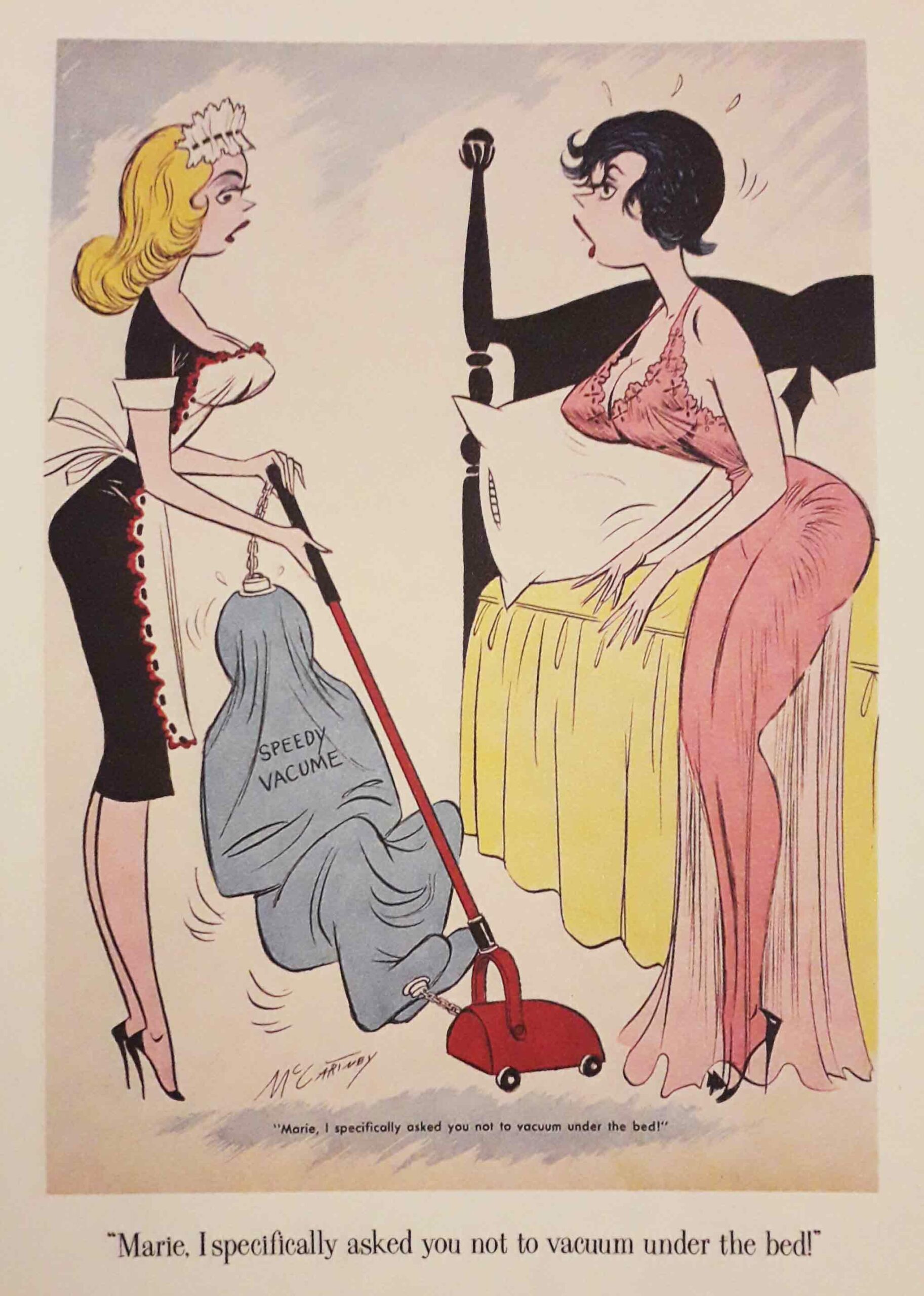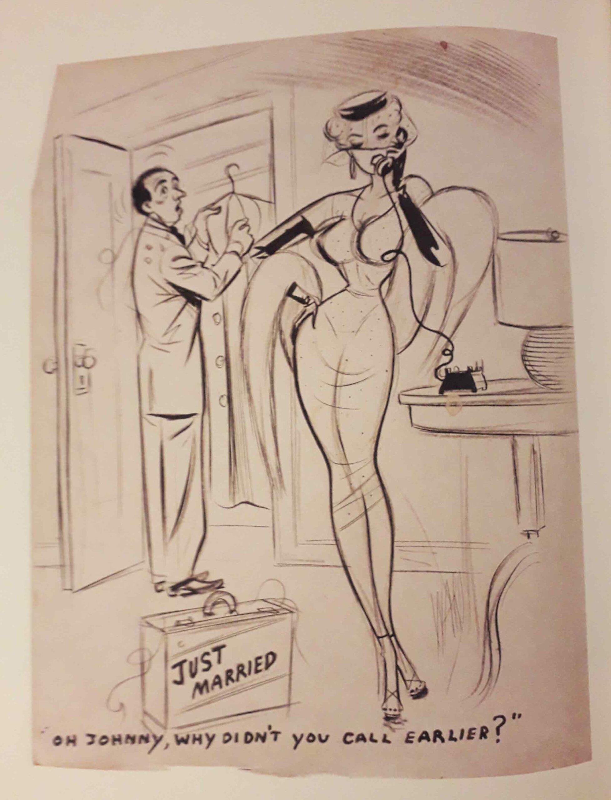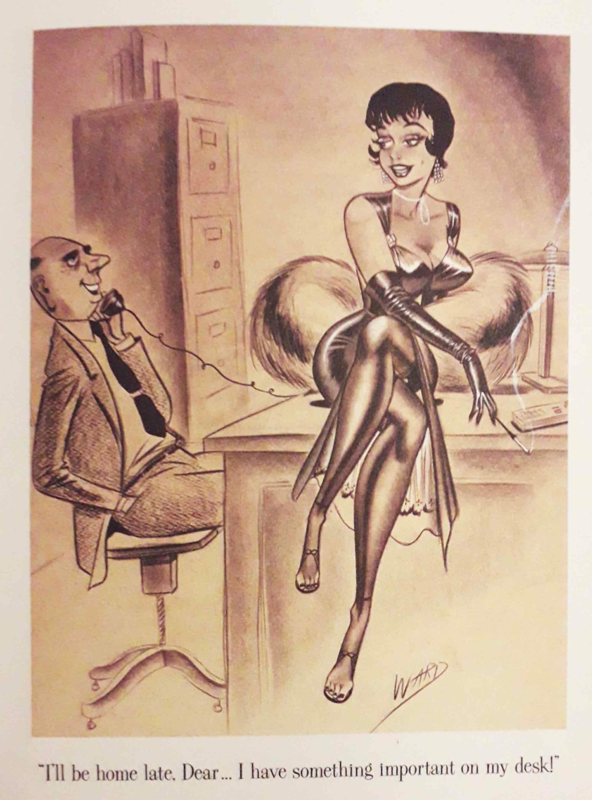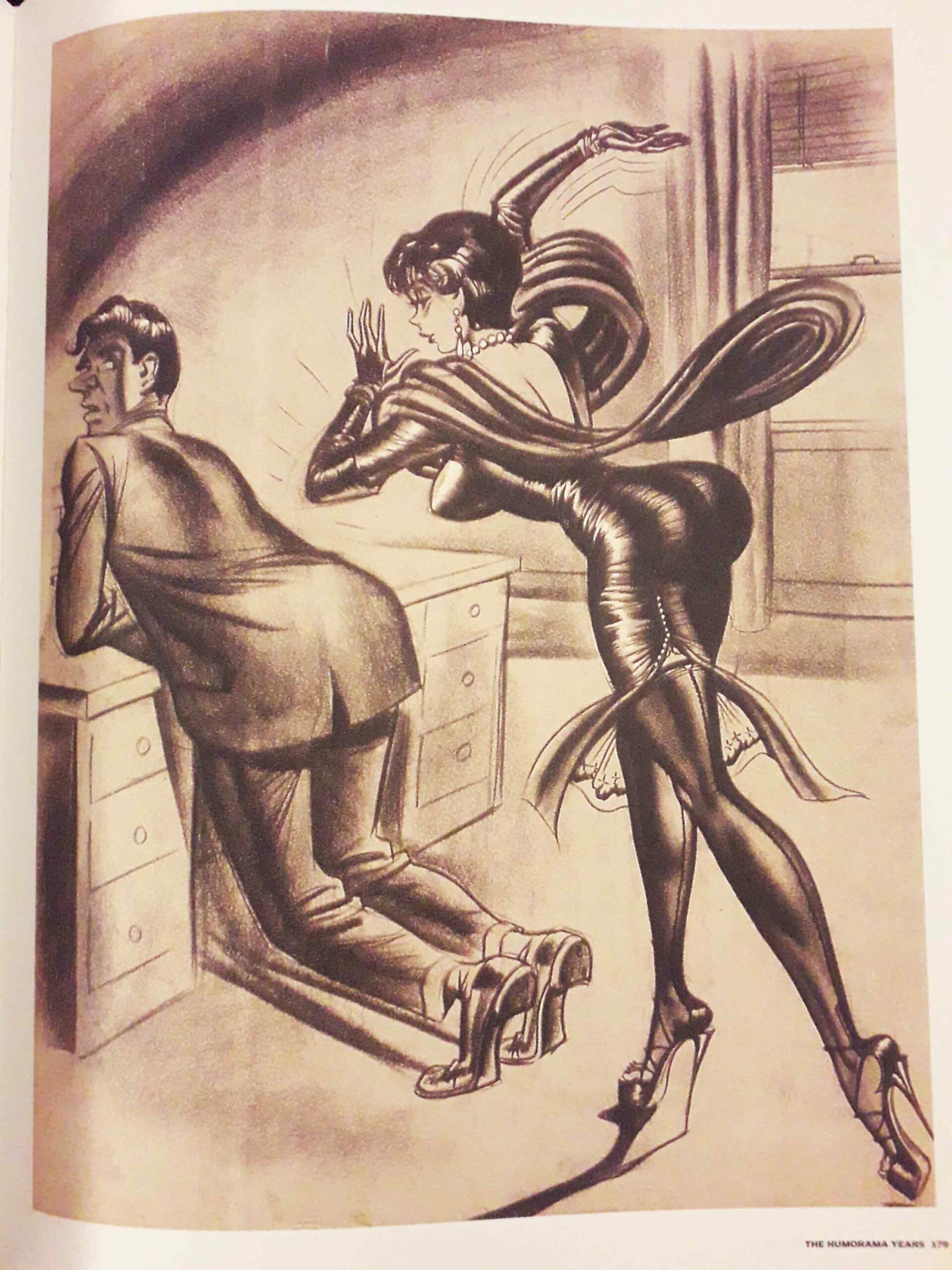 Quoi qu’il en soit, ce que je trouve de particulièrement talentueux chez Ward (notamment dans la période Humoroma), c’est la lumière qui émane de ses dessins, sa capacité à faire briller la soie des bas ou le satin des robes. Dans ses œuvres les plus abouties, les vêtements offrent un rendu vraiment superbe dans leurs textures et leurs mouvements. On y remarquera aussi que, souvent, les hommes sont penauds face aux femmes. Perchées sur leurs talons vertigineux et affichant des formes arrogantes, elles les envoûtent et les hypnotisent. L’homme chez Ward est la plupart du temps le jouet de la femme, une sorte de pantin tiré par les ficelles de son désir.