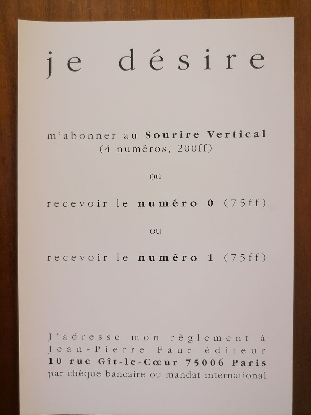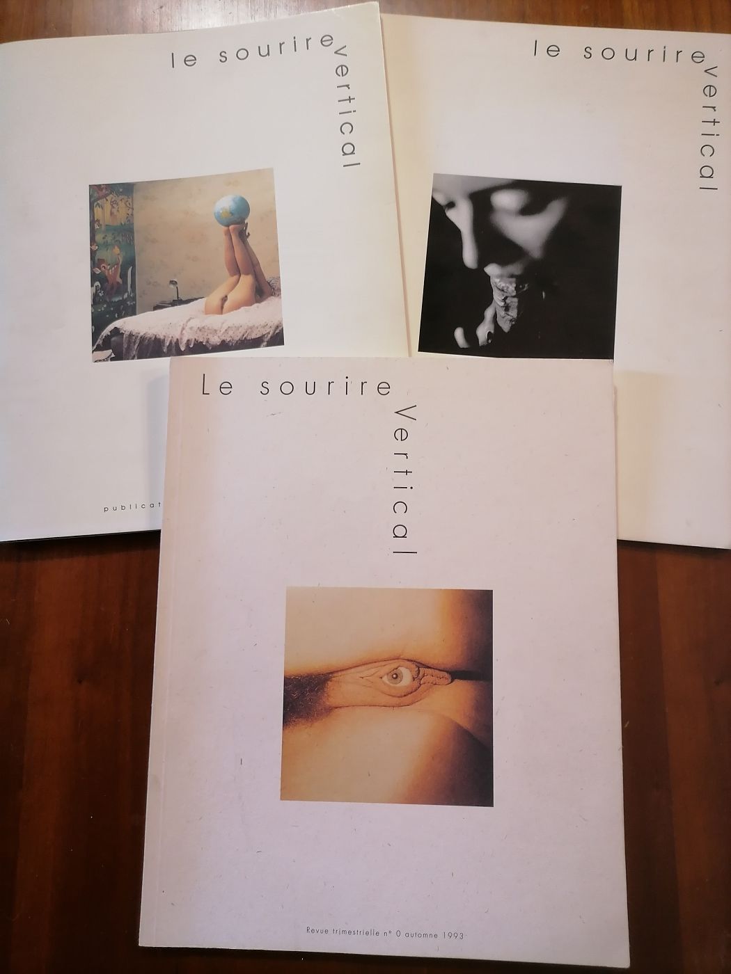 C’est complètement par hasard que je suis tombé sur cette revue : Le Sourire vertical. Je n’en avais jamais entendu parlé. Trois numéros publiés chez Jean-Pierre Faur éditeur, le 0, le 1 et le 2, respectivement de l’automne 1993, juin 1994 et mai 1995. Les trois premiers numéros, donc. Il y en a-t-il eu d’autres ? Aucune idée. Il semble en tout cas que si oui, pas énormément. Et de fait je n’ai trouvé nulle part sur internet de mention d’autres numéros.