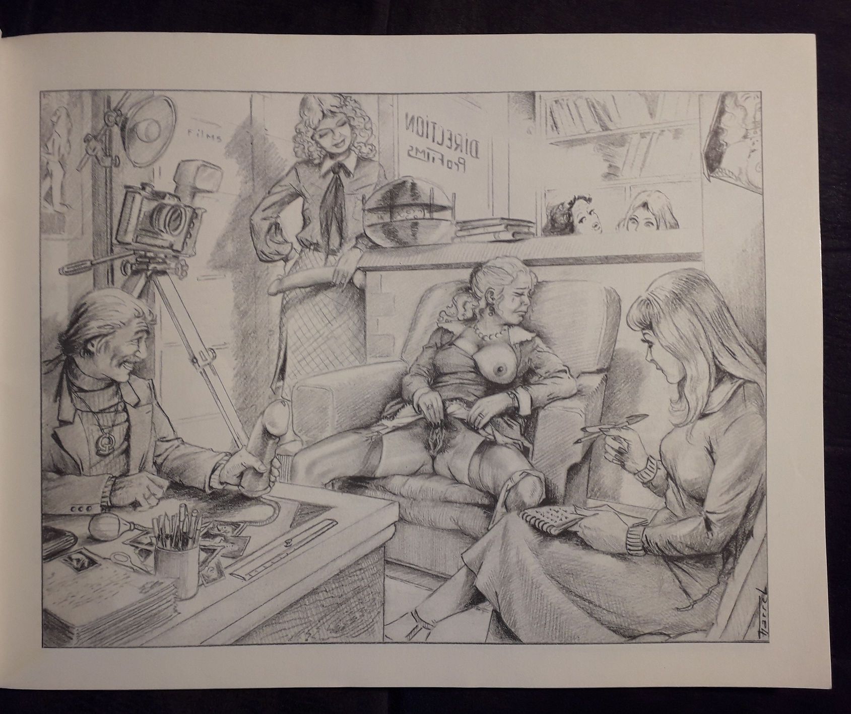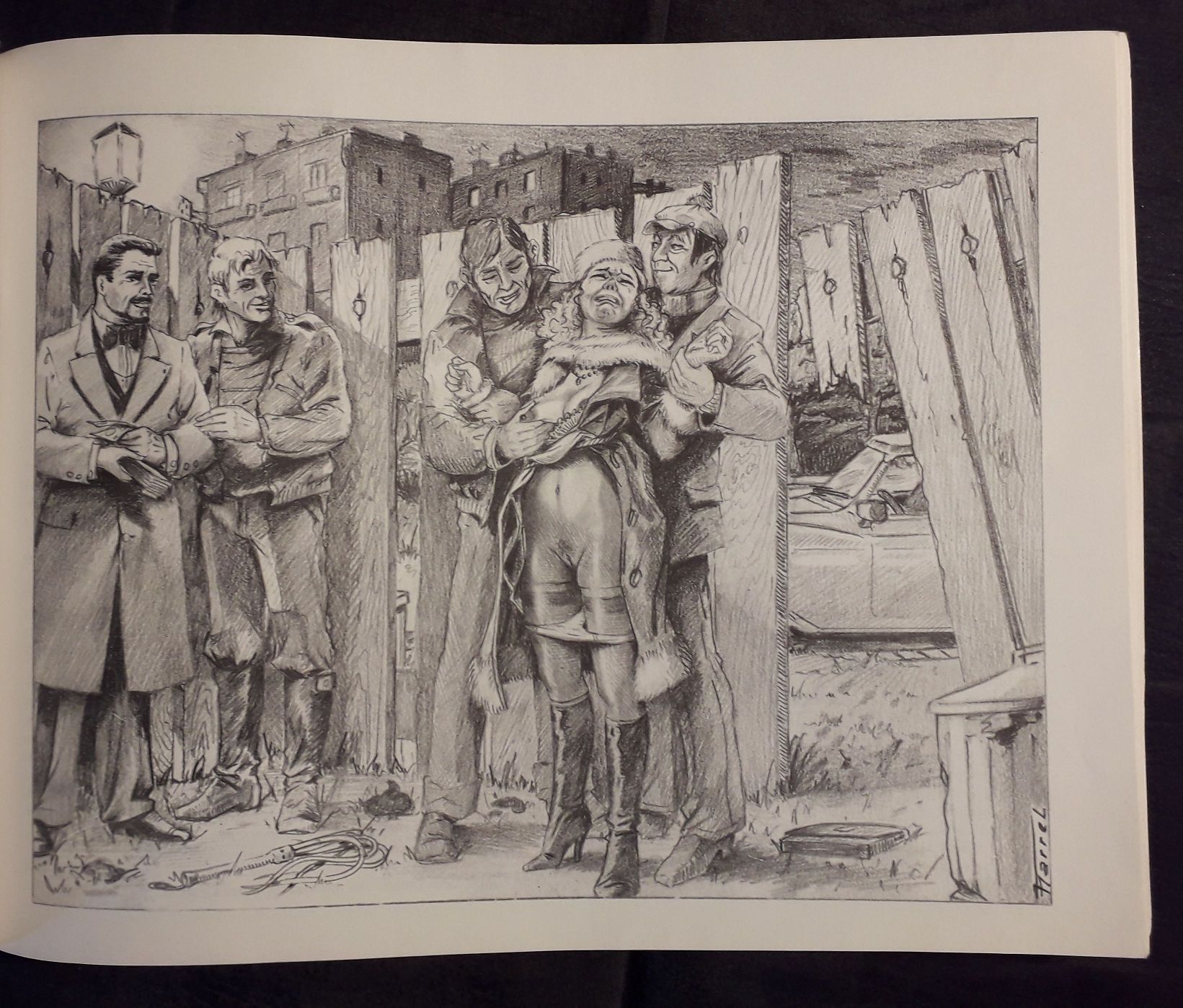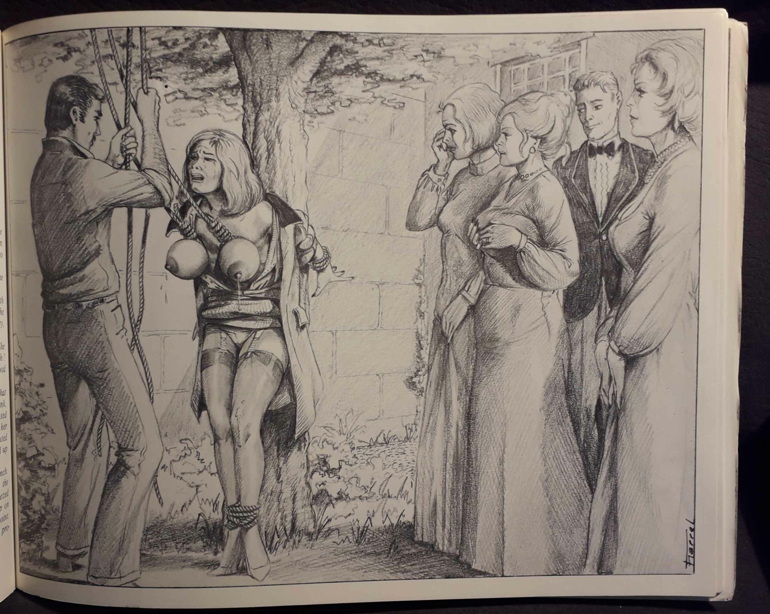 Dans les deux titres que je possède, cet autre est toujours une femme : jeune épouse à former, impertinente à recadrer, adolescente à éduquer… Farrel exécute ses dessins à la mine de plomb avec une précision remarquable, apportée notamment aux visages et à leurs expressions. Les victimes sont en pleurs, et on voit clairement sur leurs joues couler les larmes. On voit leurs traits déformés par la honte et la souffrance. Et on voit l’assurance satisfaite et le plaisir pervers du bourreau et de ses convives.
