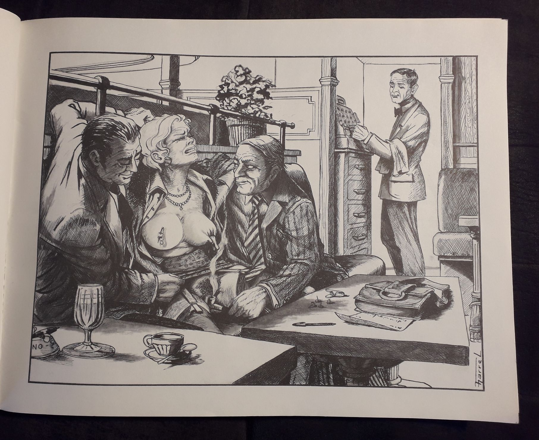Les exemplaires que je possède sont parus chez Dominique Leroy, en 1978 et 1980. Ils se présentent tous deux sous la même forme : couverture souple, format à l’italienne (une constante, semble-t-il, pour les « Farrel ») et faible pagination. Sur chaque double page, un court texte à gauche (en français et anglais) et à droite, en regard, un dessin en noir et blanc. Les textes sont de Farrel lui-même dans les deux volumes (traduits en anglais par Robert Mérodack, avec qui Farrel a collaboré par ailleurs), construits comme de brèves nouvelles. Energiques et percutants, ils apportent aux dessins un arrière-fond narratif qui leur donne toute leur signification, expliquant le pourquoi de la scène qui s’offre à notre regard.