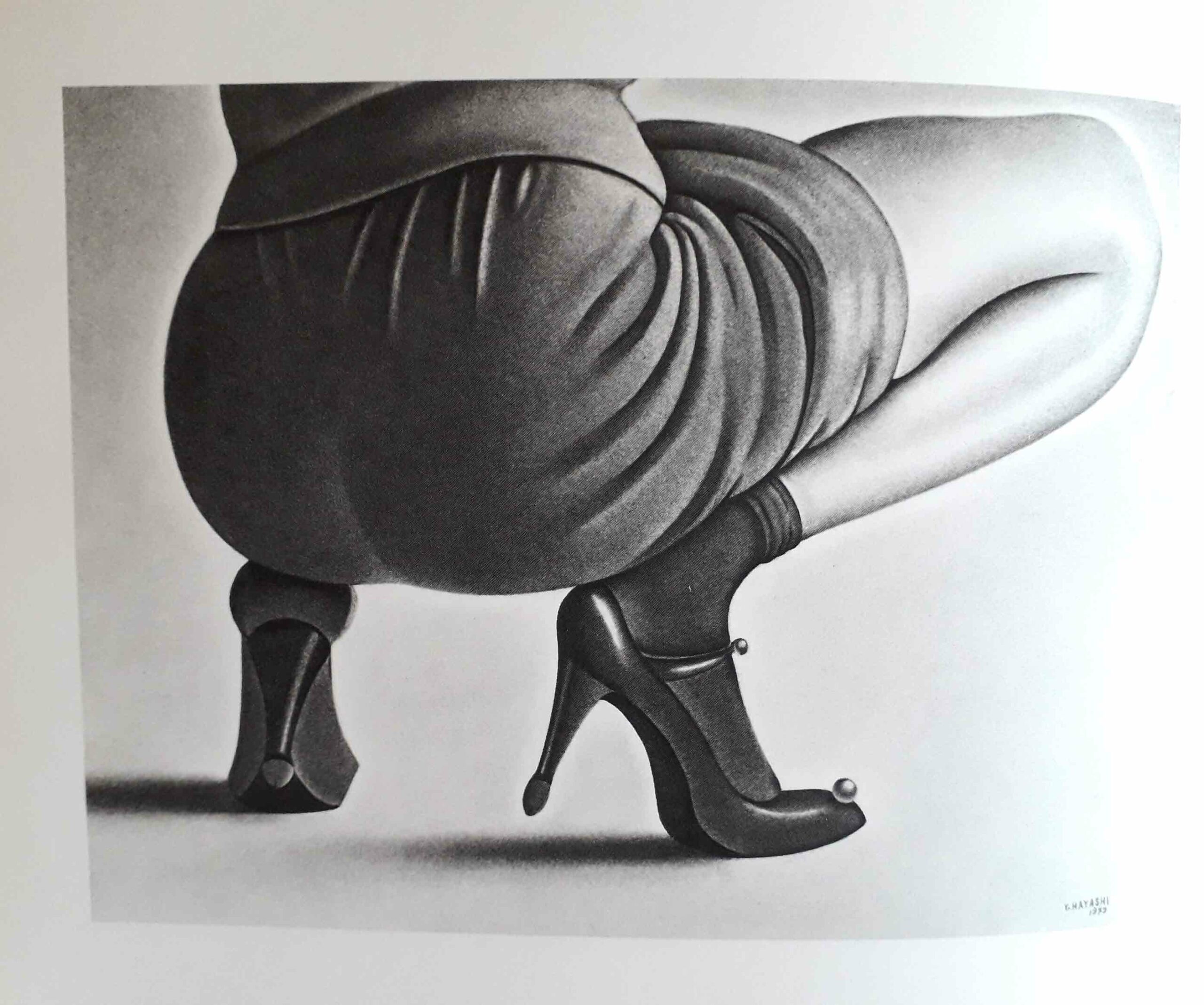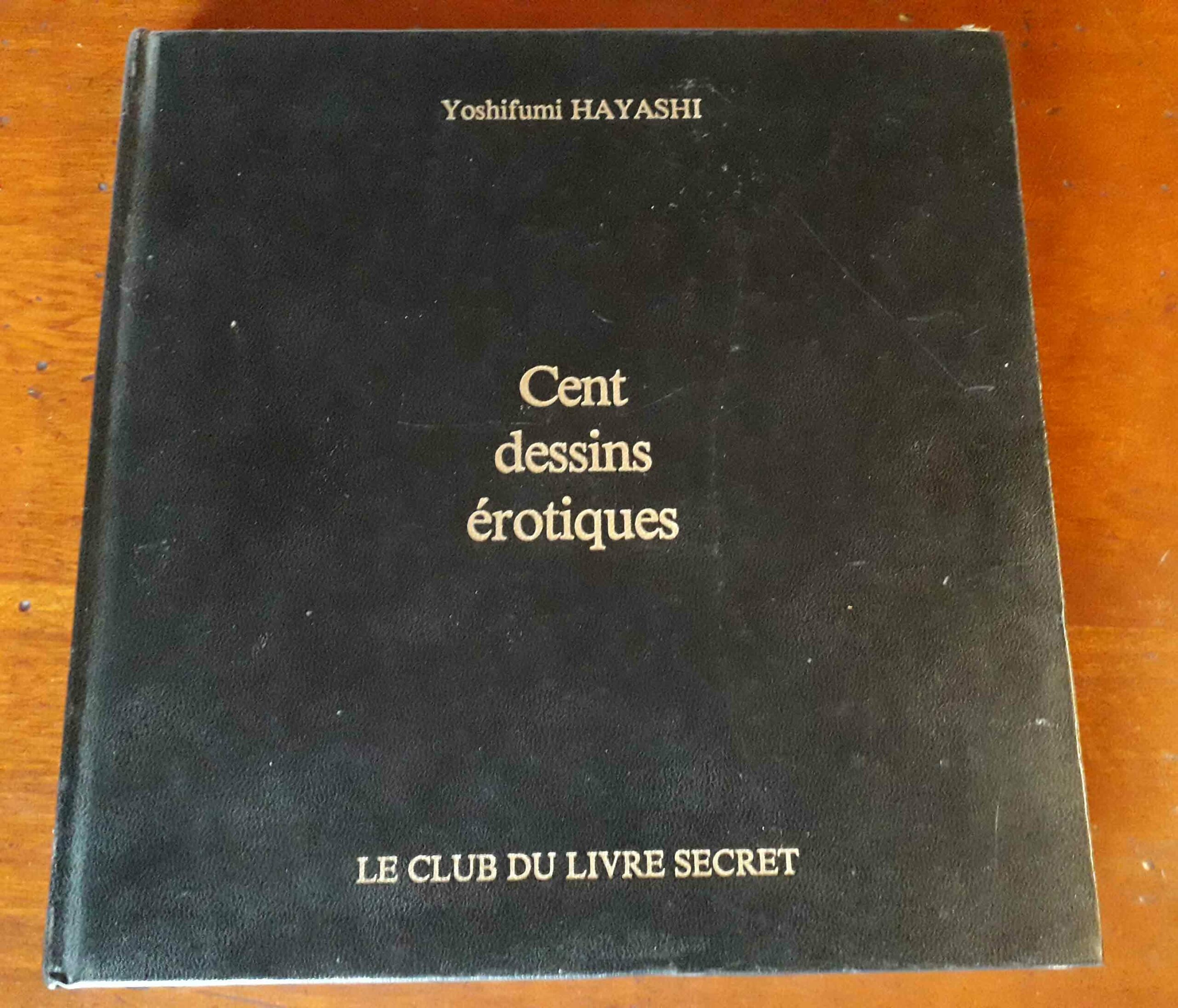 Daté de 1982, ce livre est à ma connaissance la première publication d’Hayashi. On la doit au Club du Livre secret, qui édita d’autres ouvrages de ce type, dont un Cent dessins pour illustrer Histoire d’O, par Loïc Dubigeon. Le volume adopte un format carré (20,5 x 20,5 cm), avec une couverture rigide en similicuir noir. À l’intérieur, une centaine de dessins (je ne les ai pas comptés, faisons confiance au titre) reproduits sur un papier couché qui fait honneur aux nuances de gris.