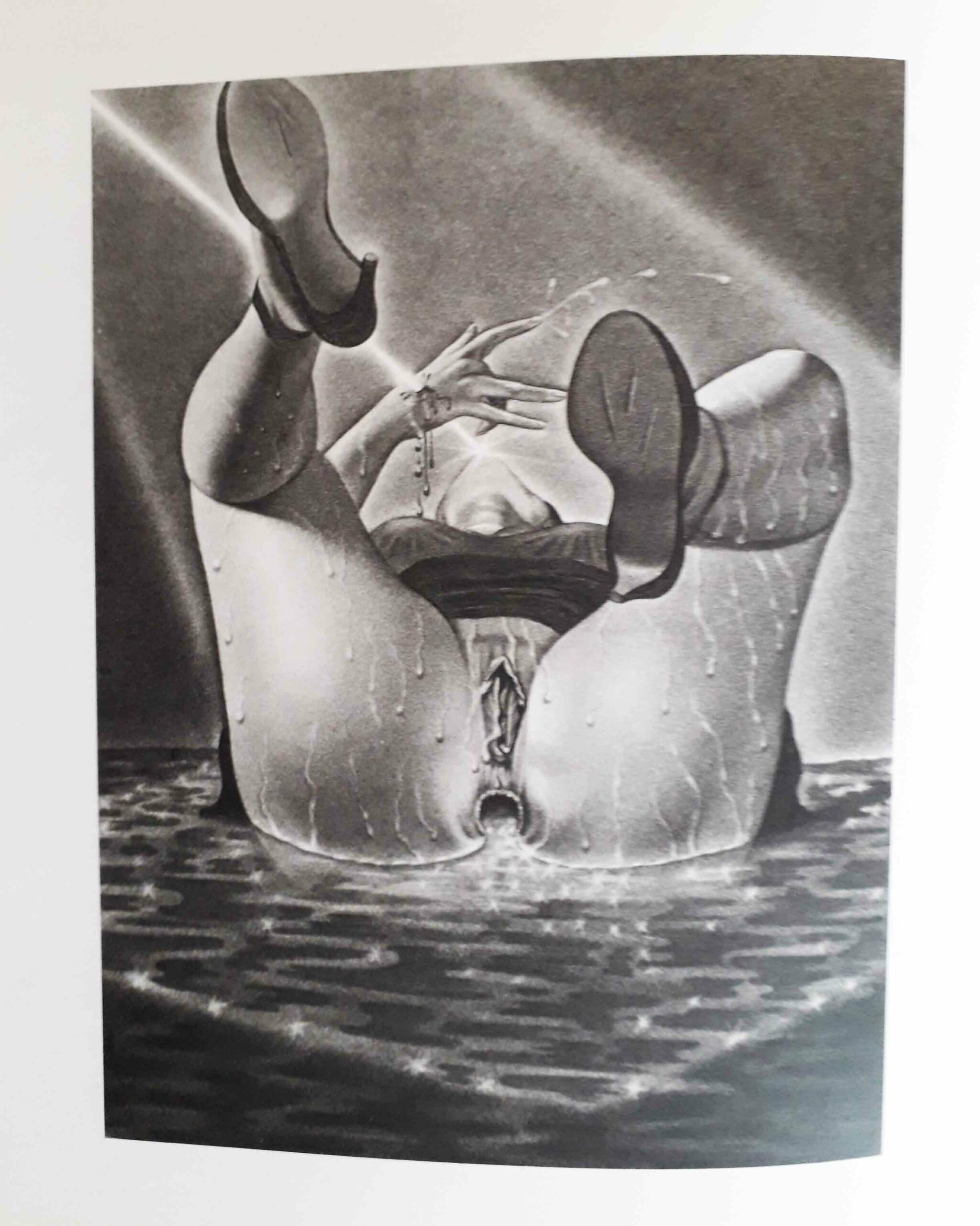 Chose paradoxale d’ailleurs, ces corps sont très souvent dégoulinant de ce qui paraît être du sperme. Comme si l’acte avait été consommé. Et pourtant, à de rares exceptions près, on ne perçoit pas d’assouvissement, mais comme un appel sans fin de la chair, un besoin comblé et cependant toujours insatiable. L’élément liquide est d’ailleurs très présent dans ces dessins, sous forme de sperme, de sécrétions vaginales, de sang plus rarement, ou de vastes étendues aquatiques qui constituent le fond de l’image.