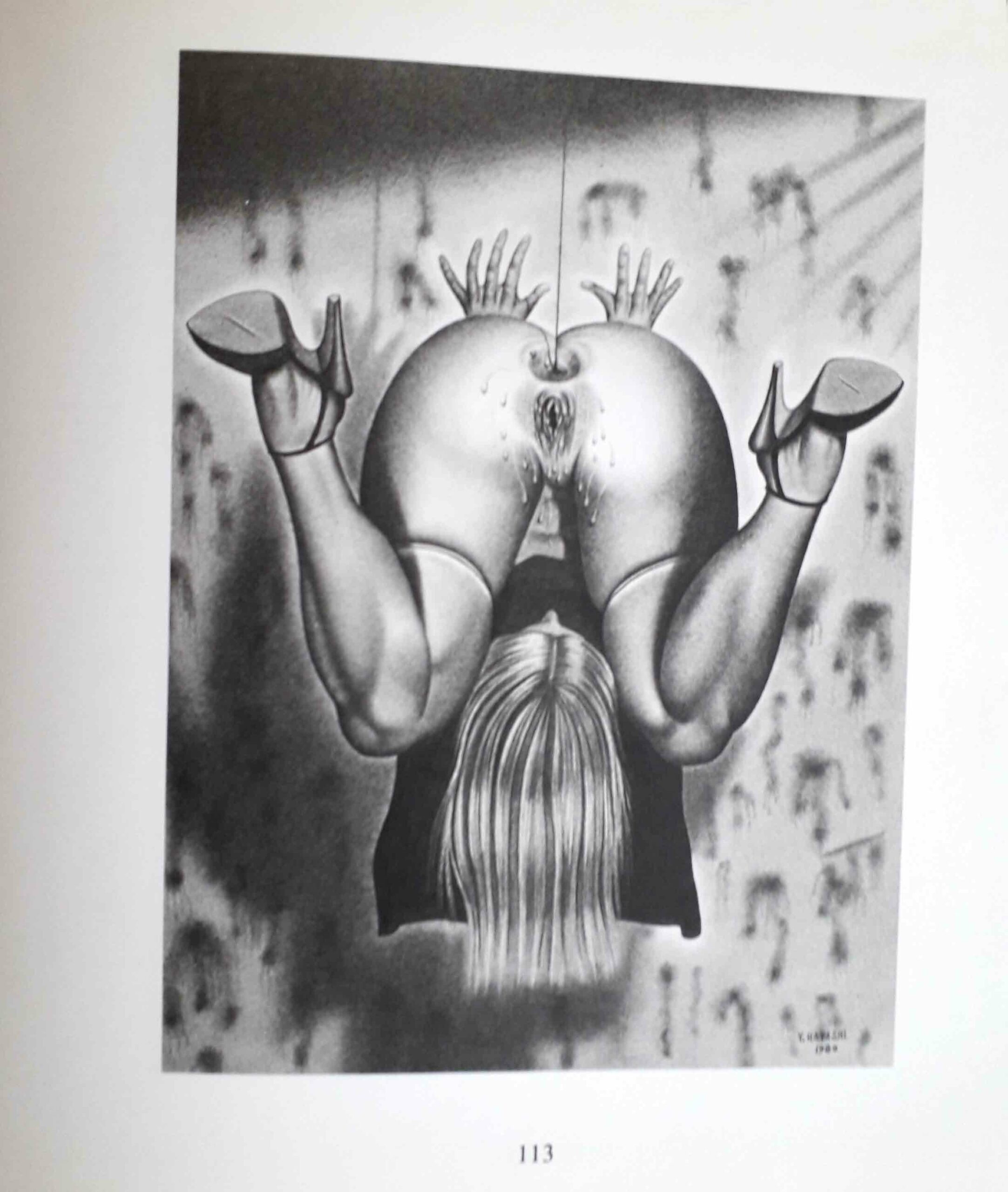 Dans ce livre, l’érotisme de Yoshifumi Hayashi est tout entier porté par la femme. Pas d’accouplement, pas de relation entre personnes ici, mais seulement des chairs offertes qui expriment un désir brut venu des profondeurs. Les femmes d’Hayashi sont sensuelles, par leurs courbes, leurs accessoires vestimentaires, mais d’une sensualité que je qualifierai d’organique. Les orifices sont béants, les corps sont des viandes. De plus, les visages sont souvent invisibles – qu’ils soient hors champ ou inaccessibles au regard du fait de la position –, de sorte que les personnages apparaissent souvent comme anonymes, dépossédés de toute personnalité individuelle. En ce sens, les dessins de Yoshifumi Hayashi constituent une incarnation du désir. Un désir fondamental et universel qui se concrétise volontiers dans des images aux connotations surréalistes.