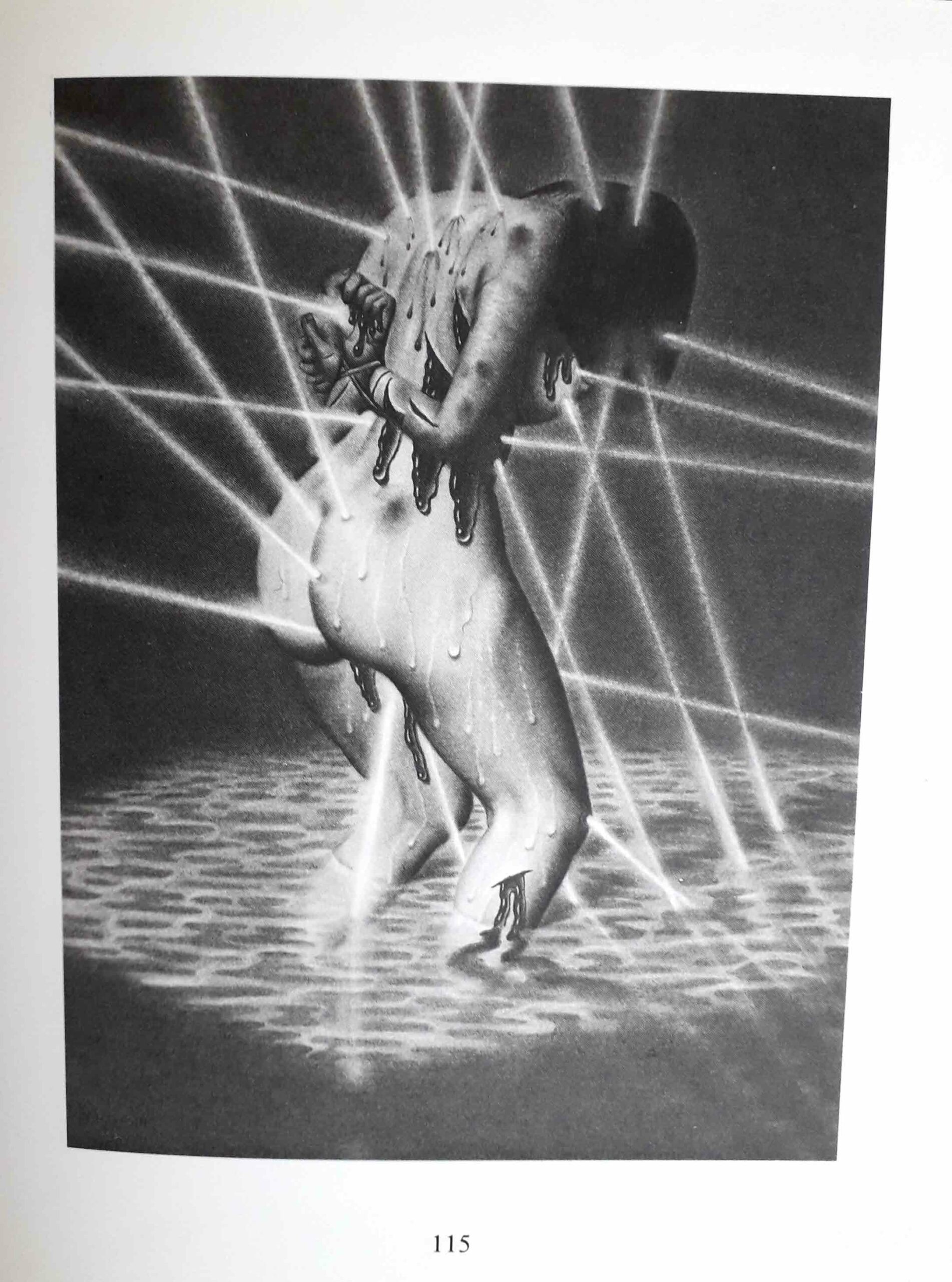 À ce propos, j’ai lu quelque part qu’Hayashi aurait été inspiré par Giorgio de Chirico. Cela paraît très probable lorsqu’on regarde les cadres dans lesquels il dessine ses femmes. Hormis les éléments liquides et organiques, les formes sont géométriques, anguleuses. Elles évoquent le béton. Elles sont froides, anonymes, sans décor. Il y a finalement comme une opposition frontale entre les corps avides de plaisir et de satiété et la réalité que dépeignent ces cadres inertes et inhospitaliers. Et d’ailleurs, je notais tout à l’heure qu’il n’y avait pas de couple dans ces dessins érotiques de Yoshifumi Hayashi, mais uniquement des femmes. Il faut ajouter que celles-ci sont toujours seules. Et de fait, il émane de ces œuvres un fort sentiment de solitude, celle du corps pris dans ses pulsions et qui ne parvient jamais à les assouvir totalement, à accéder enfin au repos de la satiété.