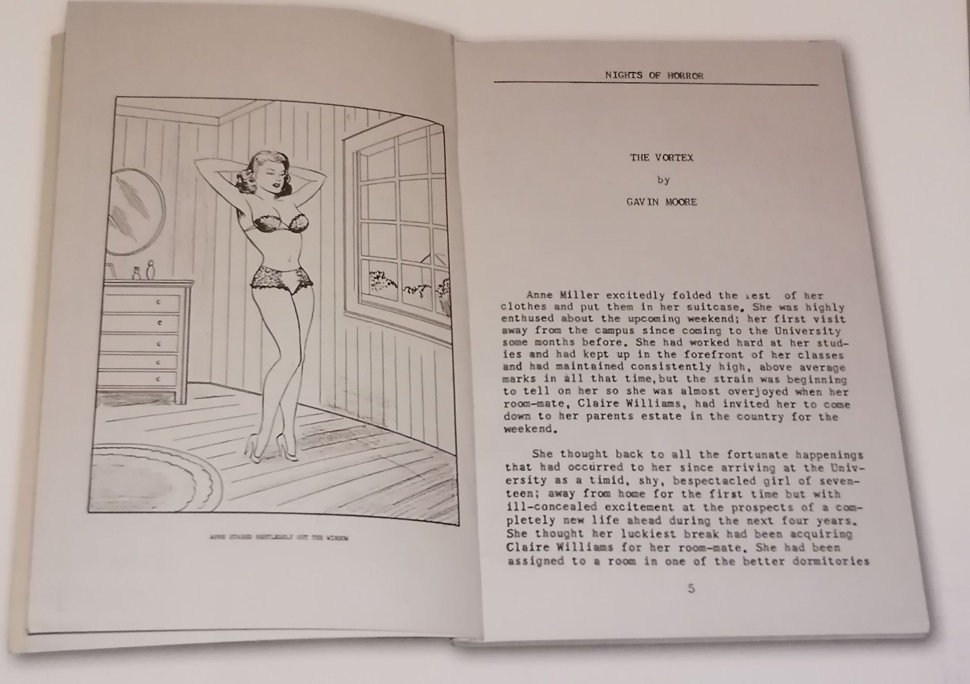 Seize pages, du texte tapé à la machine, une reproduction artisanale et une distribution dans quelques librairies spécialisées. Seize numéros seulement parurent, avant que le procès des Brooklyn Thrill Killers ne mette un terme à l’aventure. Ce fanzine était édité par Malcla, association de Eugene Maletta (« Mal »), imprimeur, et Clancy (« Cla »), auteur. Il s’agissait d’une série d’histoires illustrées sur des thèmes BDSM avec torture, humiliation, flagellation, fétichisme, etc. Les dessins restent sobres à nos yeux actuels : pas de nudité, pas de pornographie, pas de sexes visibles, mais l’ambiance est explicite. Le premier numéro parut en 1954 mais, très vite, la publication fut mêlée à un meurtre gratuit commis par quatre jeunes gens qui devint l’affaire des Brooklyn Thrill Killers. Il s’avéra en effet que le chef de cette bande était un lecteur revendiqué de Nights of Horror, et que le fanzine fut ainsi impliqué dans cette histoire comme corrupteur de la jeunesse et incitateur à la violence. La décision d’interdiction à la vente et de destruction de tous les exemplaires remonta jusqu’à la Cour suprême des États-Unis qui, en 1957, par cinq voix contre quatre, confirma la sentence. Joe Shuster, dont le nom n’apparaissait nulle part ici, ne fut jamais inquiété.*