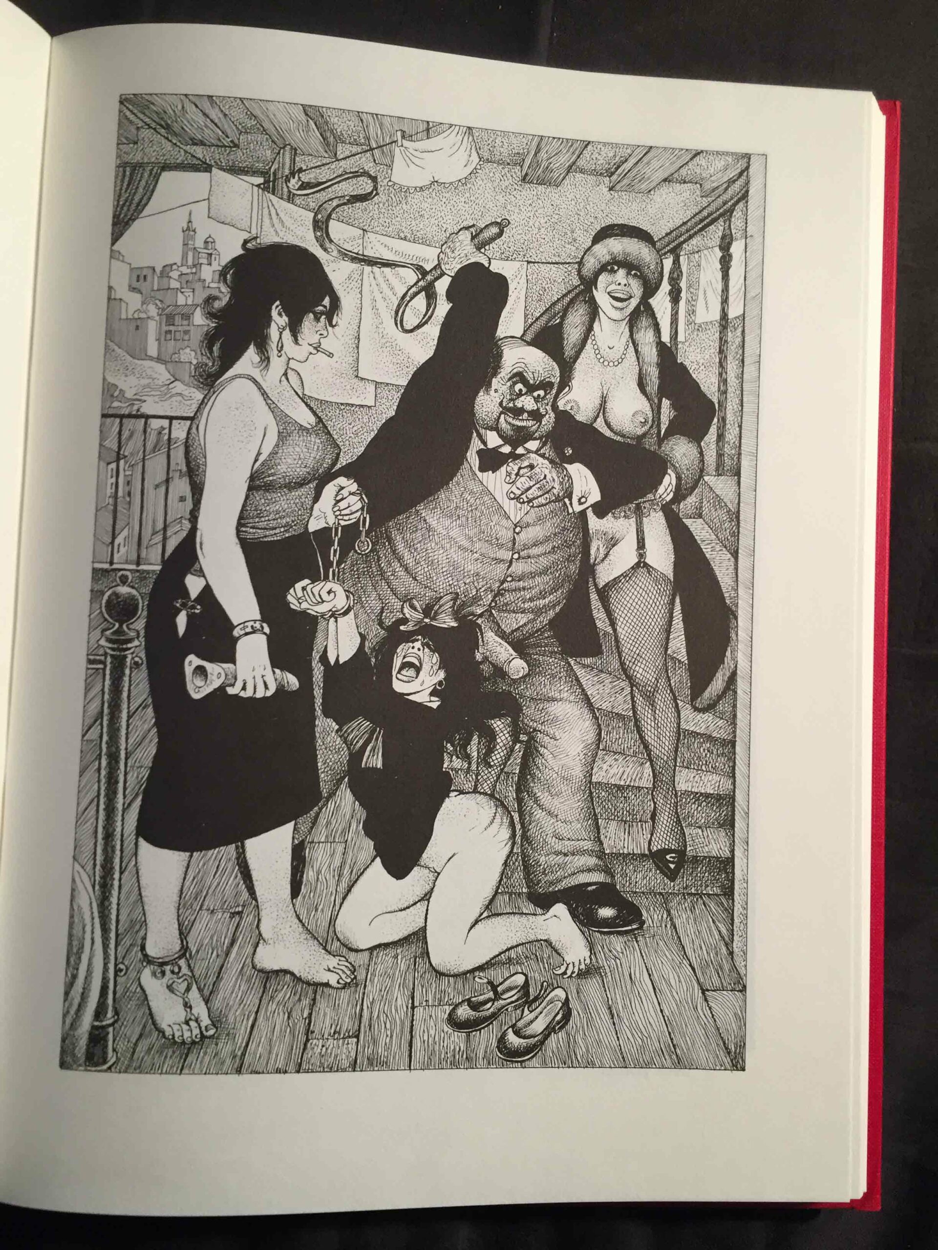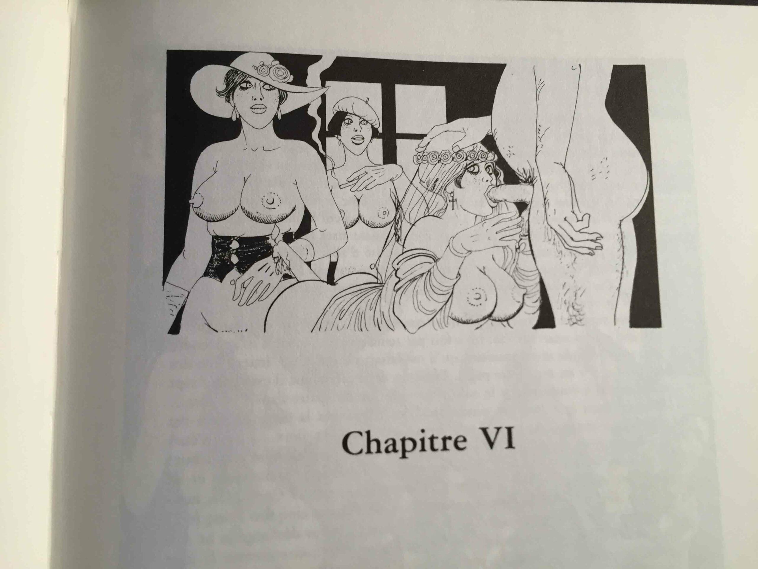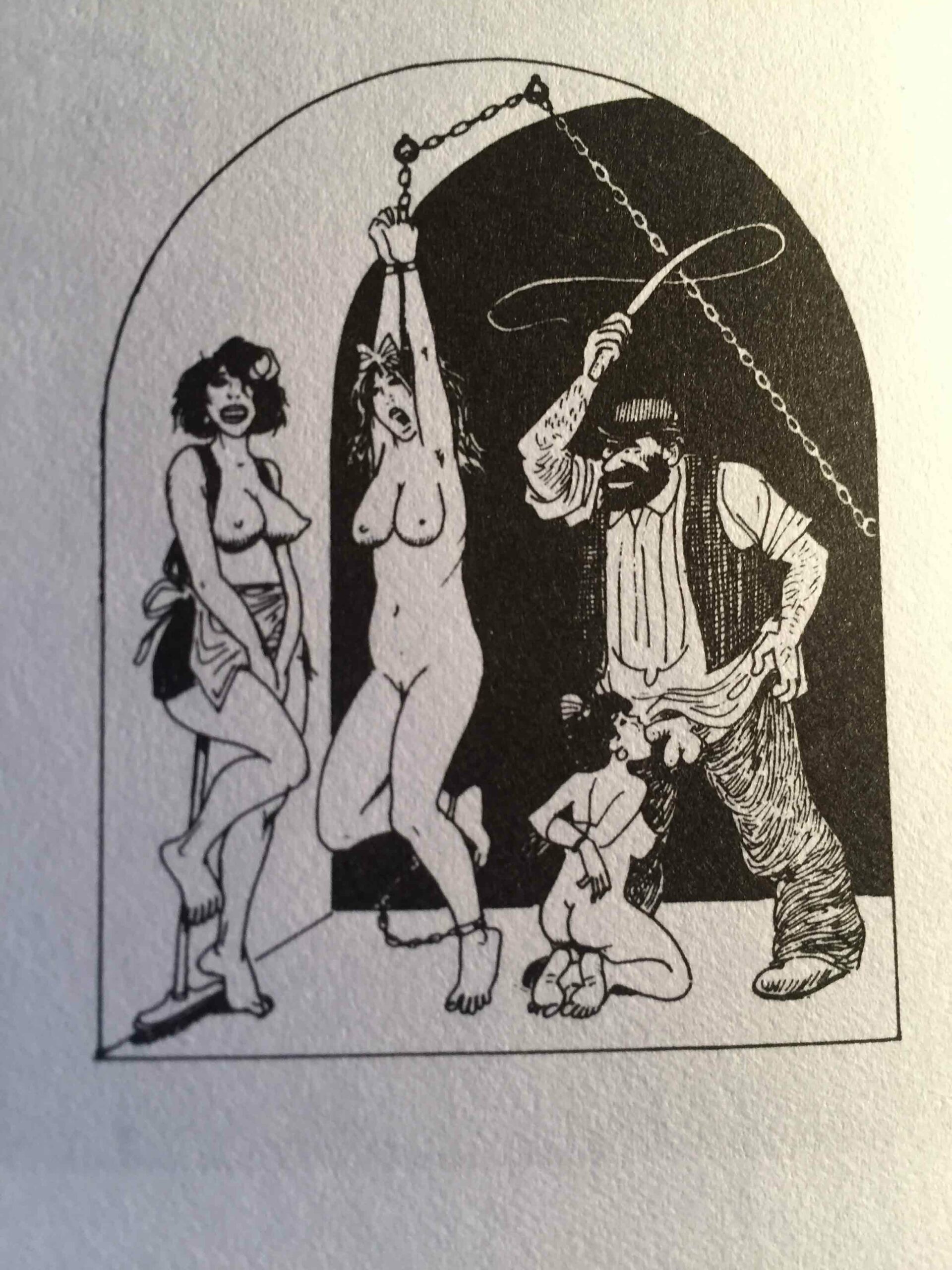 Côté illustrations, c’est donc Georges Pichard qui fut à l’œuvre. Né en 1920 et mort en 2003, il est un auteur et illustrateur incontournable de la BD érotique et pornographique française (Ténébrax, Paulette, Blanche Epiphanie, Marie-Gabrielle de Saint-Eutrope, entre autres). Ses dessins présentent des femmes aux formes affirmées, affichant des poitrines lourdes et conquérantes et des hanches généreuses. Les bouches sont voluptueuses et les yeux volontiers en amande. L’ambiance Années folles est joliment restituée ici, notamment à travers les costumes et les objets. On y trouve par ailleurs plusieurs scènes sadomasochistes qui, dans mon souvenir, ne se trouvent pas (du moins à ce point) dans le texte de Pierre Louÿs, mais qui ne sont pas pour me déplaire.