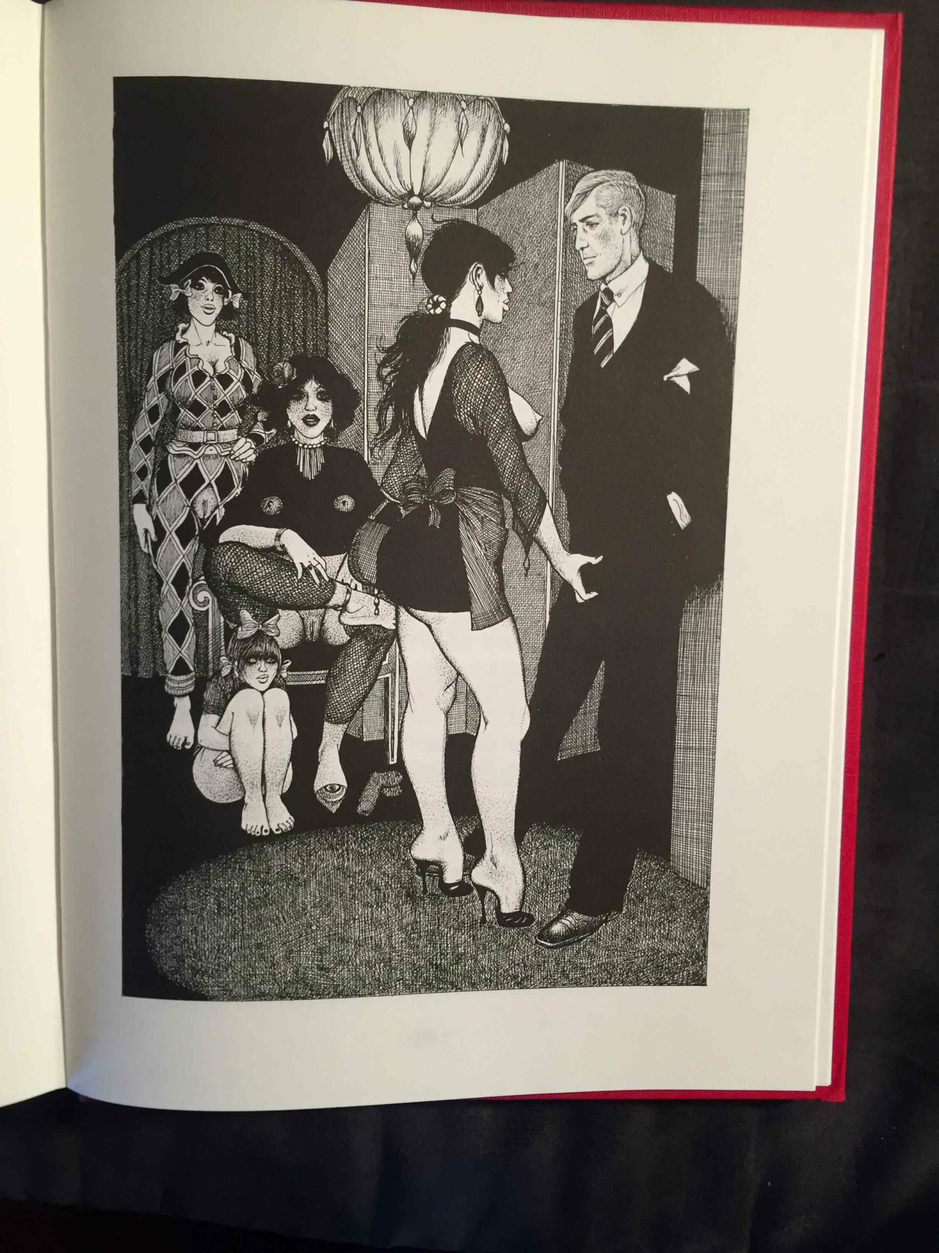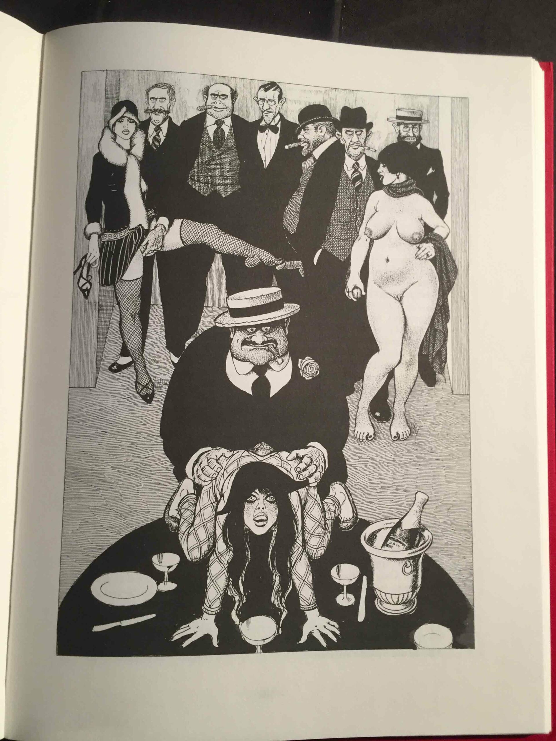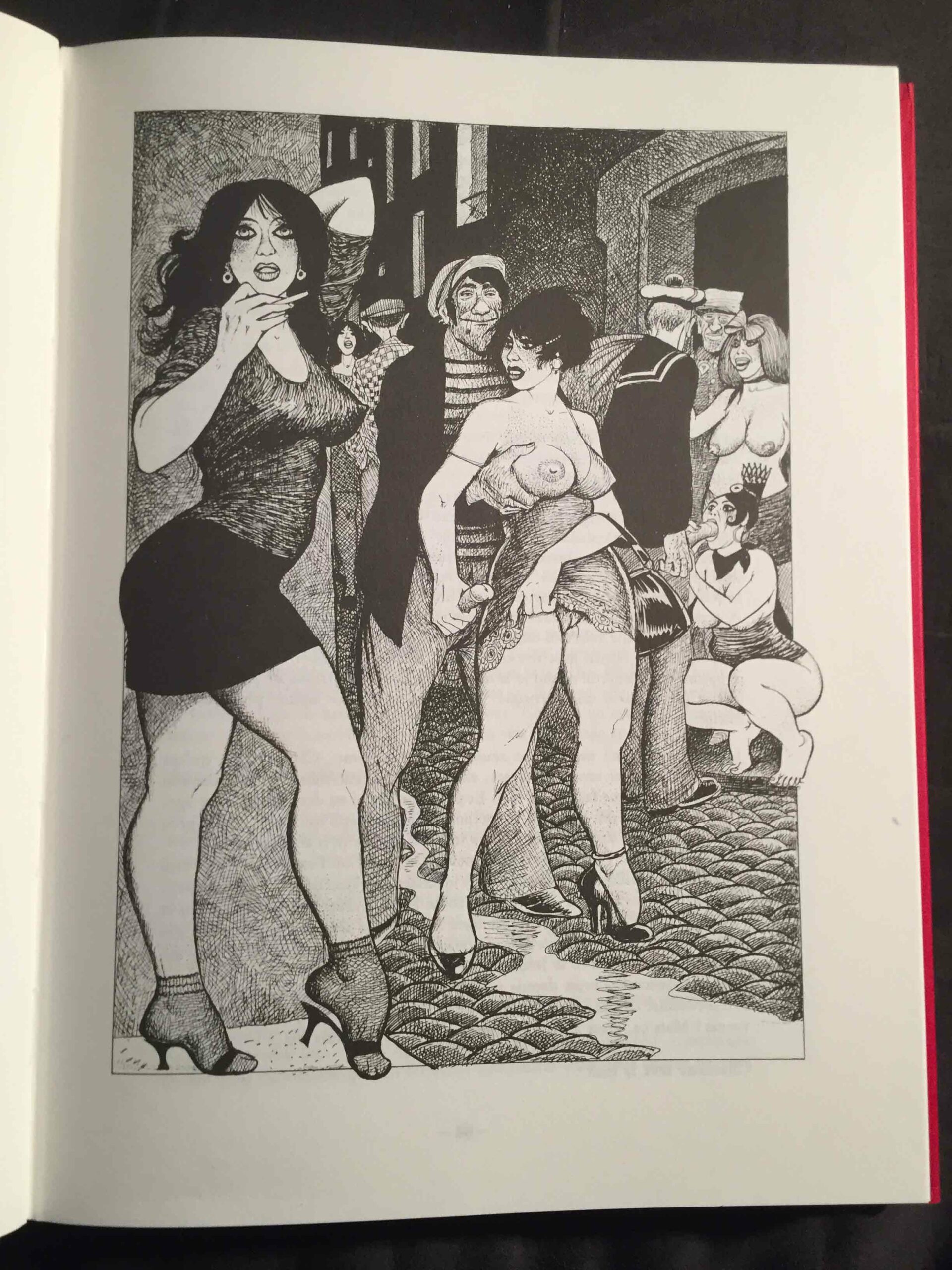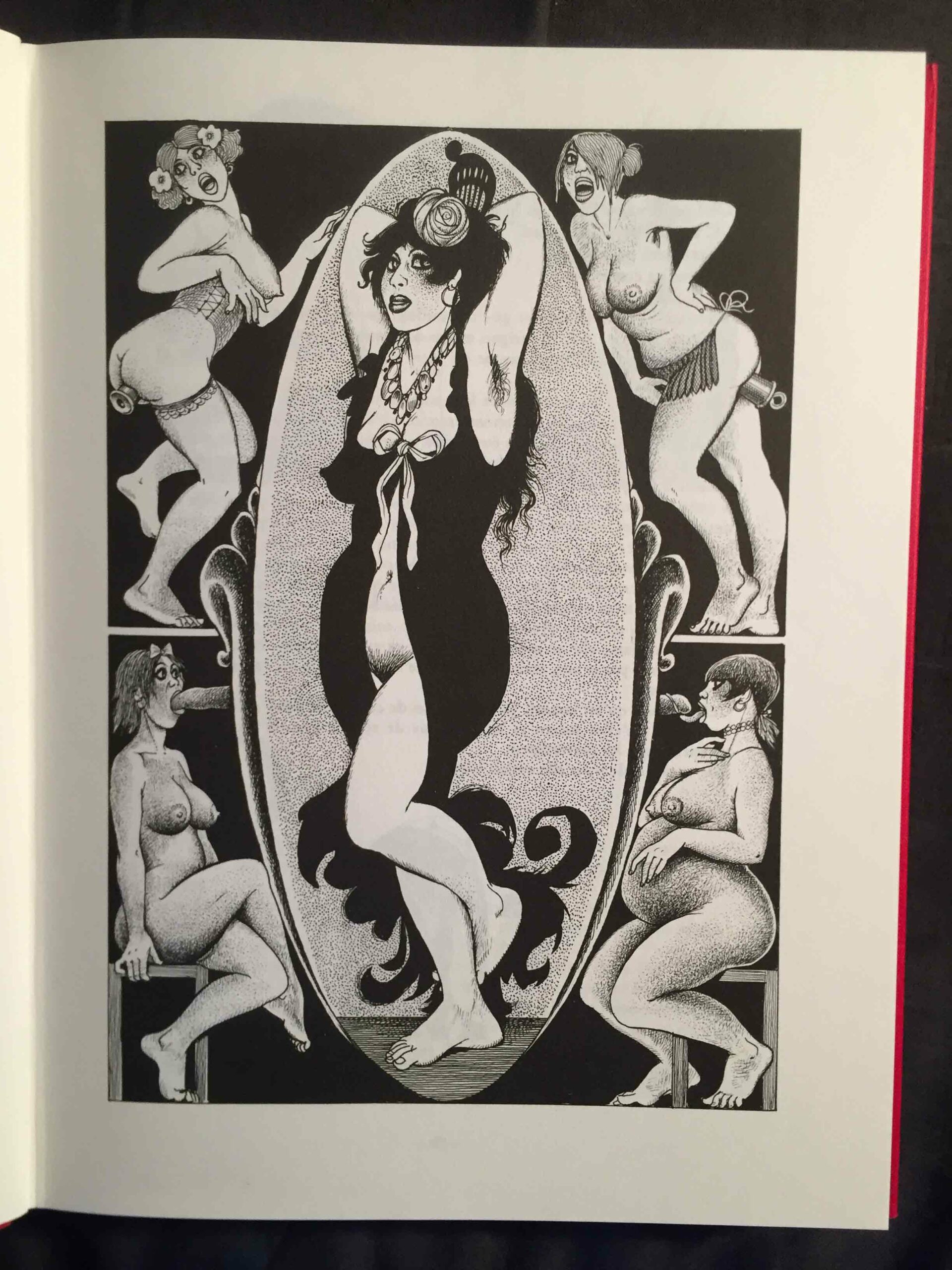 Côté illustrations, c’est donc Georges Pichard qui fut à l’œuvre. Né en 1920 et mort en 2003, il est un auteur et illustrateur incontournable de la BD érotique et pornographique française (Ténébrax, Paulette, Blanche Epiphanie, Marie-Gabrielle de Saint-Eutrope, entre autres). Ses dessins présentent des femmes aux formes affirmées, affichant des poitrines lourdes et conquérantes et des hanches généreuses. Les bouches sont voluptueuses et les yeux volontiers en amande. L’ambiance Années folles est joliment restituée ici, notamment à travers les costumes et les objets. On y trouve par ailleurs plusieurs scènes sadomasochistes qui, dans mon souvenir, ne se trouvent pas (du moins à ce point) dans le texte de Pierre Louÿs, mais qui ne sont pas pour me déplaire.